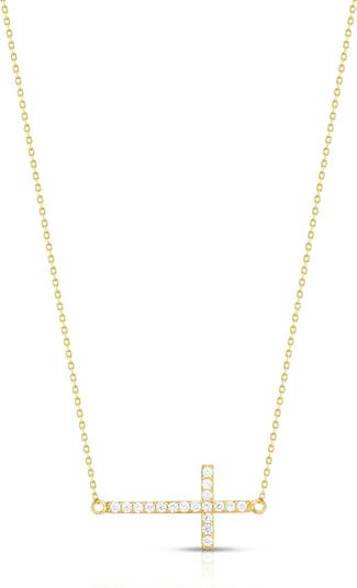 A sideway cross sparkles with cubic zirconia on this chain necklace made of sterling silver plated in rhodium.