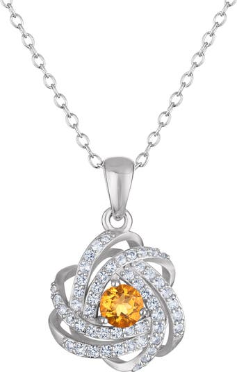 A knot-shaped pendant is centered by a stone of your choice and strung upon a dainty sterling silver chain necklace.