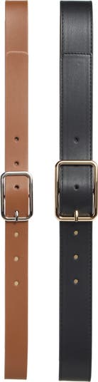 Double up on style with this two-for-one set that includes two assorted faux leather belts with gleaming bar buckles.
