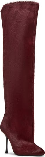 A slender toe and svelte heel add fierce balance to a dramatic boot featuring an over-the-knee silhouette and notched topline for stunning dimension.