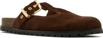 Casual and sophisticated style strike a perfect balance on this buckle-embellished clog fashioned from smooth suede.