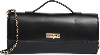 Carry your essentials in this sleek faux-leather clutch framed by a woven chain strap and gleaming hardware.