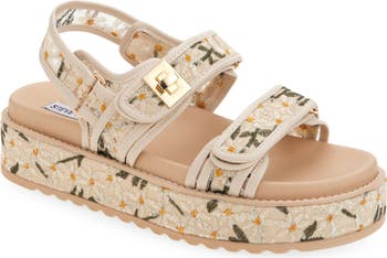 Delicately embroidered daisies and an unexpected turnlock bring garden-party charm to this flatform sandal fitted with an anatomically contoured footbed.