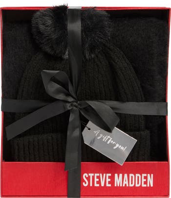 A fuzzy black scarf and matching pompom-topped beanie bring cozy warmth and a smart finish to any favorite cold-weather look. Packaged in a box that's perfect for gifting, they make a great choice for friends, family and everyone else on your list who needs some snuggly, goes-with-everything comfort.