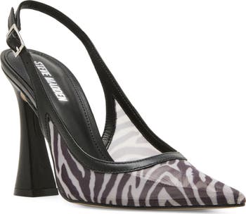 A pointy toe and chunky flare heel bring fierce balance to a striking pump fitted with an adjustable slingback strap for a secure fit.