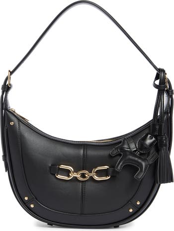 A trio of polished chain links and round studs detail the front of this compact shoulder bag made from textured faux leather.