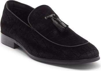 Twin tassels adorn the top of this croc-embossed loafer rendered in chic velvet with smooth leather trim.