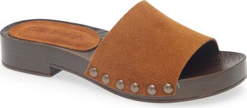 Dome studs and a wooden platform give a clog-inspired kick to this summery sandal.