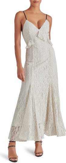 Channel playful retro style in this A-line dress featuring dainty ruffles and dots atop the sheer mesh overlay.