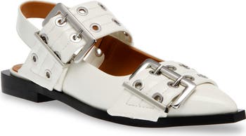 Glinting buckles and grommets lend punk-rock glam to a sleek flat completed by a pointed toe.
