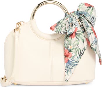 High-polish charms amp up the glam energy of this richly grained faux-leather handbag topped with ring-style top handles and adorned with a floral-print scarf for added flair.
