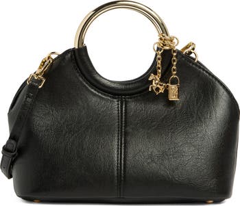 High-polish charms amp up the glam energy of this richly grained faux-leather handbag topped with ring-style top handles.