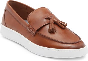 Fringed tassels add classic detail atop a sophisticated slip-on shaped from smooth leather and ground on a rubber sole for durability on workdays or special occasions.