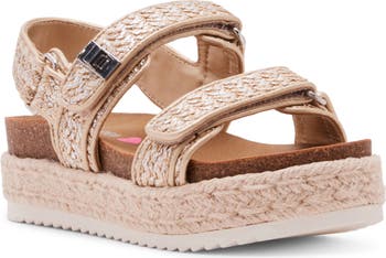 A breezy seaside classic is sized down for your mini-me in this espadrille-inspire platform sandal secured by easy-on hook-and-loop straps.