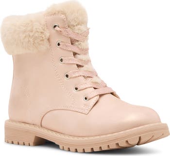 Fluffy faux-fur trim adds kid-approved flair to the cuff of a combat boot that's built on a durable lugged sole to increase their traction no matter the season.