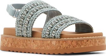 Sparkling rhinestones peek out from beneath the woven raffia straps on a boho-cool slingback sandal set on a cork platform and treaded sole.