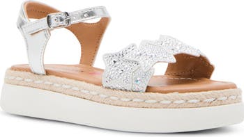 Jewel-encrusted star appliqués bring out-of-this-world charm to an espadrille-inspired sandal set on a jute-wrapped midsole and chunky platform. An adjustable buckle closure provides a secure and play-ready fit.