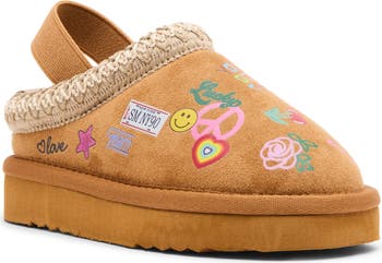 Playful graphics add a touch of whimsy to this slingback clog lined with plush faux shearling.