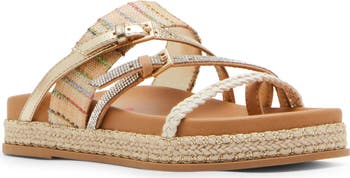 Mixed-media straps crisscross over the vamp of an espadrille-inspired slide sandal set on a contoured footbed and jute-wrapped platform sole.
