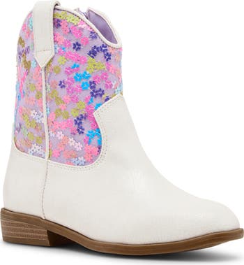 Sweeten your kid's day with this mini flower–embellished Western boot made with a lightly cushioned footbed, easy side-zip closure and low block heel.