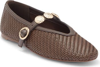Polished hardware defines the buckled strap that secures your foot in a woven flat crafted from soft faux leather to elevate your look.