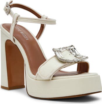 Chunky crystal buckles adorn both straps of a dancefloor-worthy platform sandal that's lofted by a towering block heel.