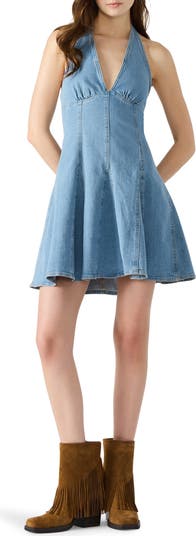 A flared skirt adds a fun flourish to a sleeveless halter dress made from stretch-kissed denim in the perfect blue wash.
