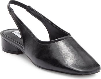 A squared toe and slingback strap define a sophisticated faux-leather pump set on a kitten heel for trend-right style.