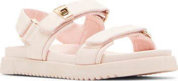 Goldtone buckles add kid-approved shimmer to the adjustable straps of an easy-on/stay-on sandal set on a low, cushy platform.