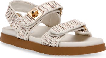 Polished goldtone hardware ups the glam factor of an essential three-strap sandal set on a molded footbed.