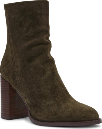 A full-length counter zipper offers easy entry and a secure fit on a supple suede bootie featuring a plain toe and chunky, stacked heel for comfortable balance.