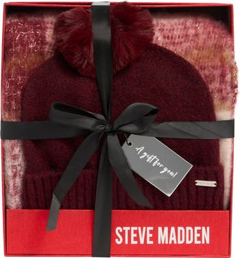 A fuzzy plaid scarf shimmering with bits of tinsel pairs with a soft, pompom-topped beanie to bring cozy warmth plus a touch of sparkle to any cold-weather outing. Packaged in a box that's perfect for gifting, they make a great choice for friends, family and everyone else on your list who needs some bright, snuggly comfort.