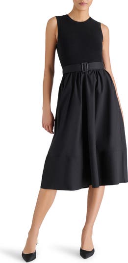 A full poplin skirt contrasts the soft sweater-style bodice of this mixed-media midi dress cinched with a matching belt.