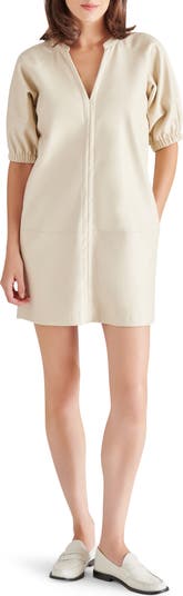 Faux leather gives an elevated appeal to a shift dress defined by elbow-length sleeves and handy pockets to boost the utilitarian silhouette.