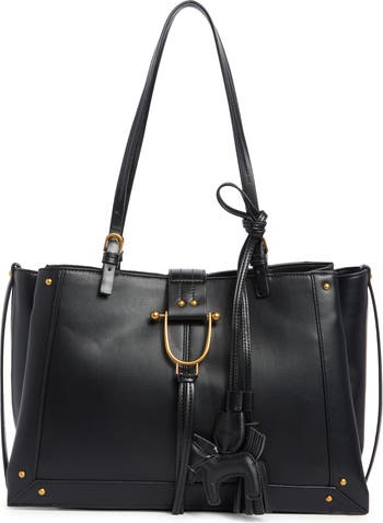 A spacious triple compartment helps keep your essentials organized and together in this faux-leather tote detailed with gleaming hardware and puffy-horse keychain.