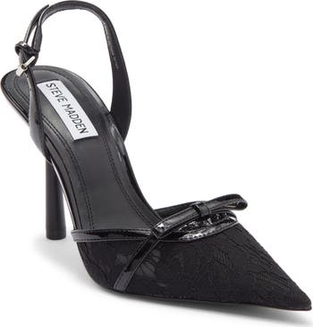 A floral lace toe box and dainty bow sweeten this elegant slingback pump lifted by a chic stiletto heel.