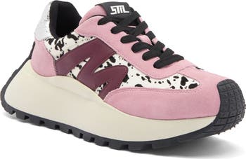 A chunky platform lofts a sporty sneaker with a low-profile silhouette designed with a playful mix of colors and finishes.