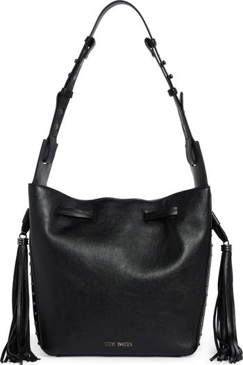Threaded tassel drawstrings cinch the topline of this faux-leather bucket bag detailed with small-scale studs.
