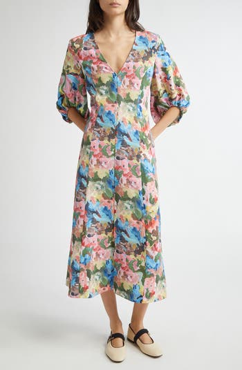 Brushstroked blooms paint pretty colors across a party-ready dress designed with full sleeves and served in a beloved midi length.