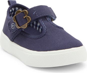 A floral buckle brings fun style to this machine-washable canvas sneaker secured by an adjustable hook-and-loop strap and grounded by a grippy white sole.