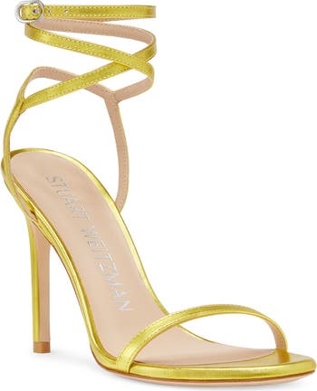 Crisscrossing ankle straps and a lofty stiletto heel further the contemporary glamour of this party-ready sandal.