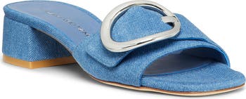 A polished buckle gleams at the vamp of a denim slide sandal balanced by a square toe and low block heel.
