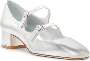 Adjustable mary jane straps offer retro appeal and a secure fit in a polished pump framed by a square toe and wrapped block heel.