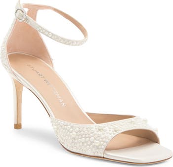 Lustrous imitation pearls bring endless elegance to a wedding-ready satin sandal lifted by a slender stiletto and shut with a dainty ankle strap.