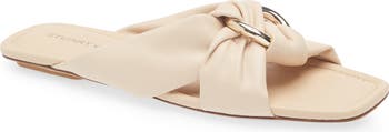 Gleaming ring hardware secures the softly knotted straps of this refined slide sandal crafted from supple leather.