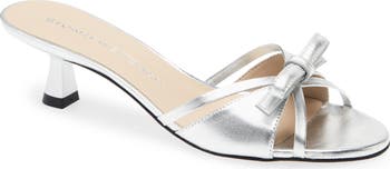A dainty bow top the cutout band of this elegant slide sandal elevated by a low sculptural heel.