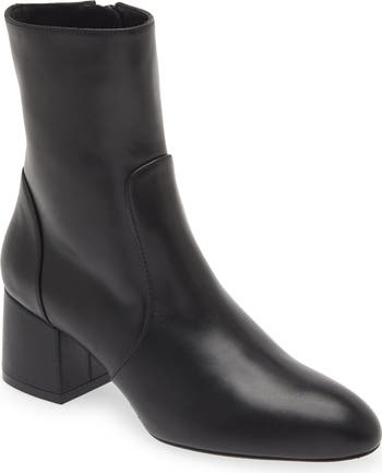 A side zipper offers easy entry on a versatile bootie balanced by an almond toe and flared block heel.