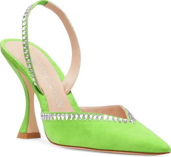 Faceted crystals bring glitz and glamour to a slingback pump designed with an architectural heel and sleek pointy toe.