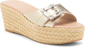 A crystal-embellished buckle add a dose of glam to the leather strap on a boho-cool slide sandal lifted by a raffia-wrapped platform and wedge heel.