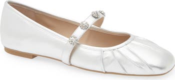 Crystal embellishments add an elegant flourish to this Spanish-made mary-jane flat rendered in metallic leather and shaped by a modern squared-off toe.